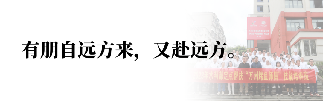 万州烤鱼培训中心以“培训带动创业,创业带动产业,产业带动就业”的总体思路,传承烤鱼文化,培养高端人才,引领万州烤鱼全产业链发展。9月27日,2023年水利部定点帮扶技能培训第二期班结业仪式圆满落幕。